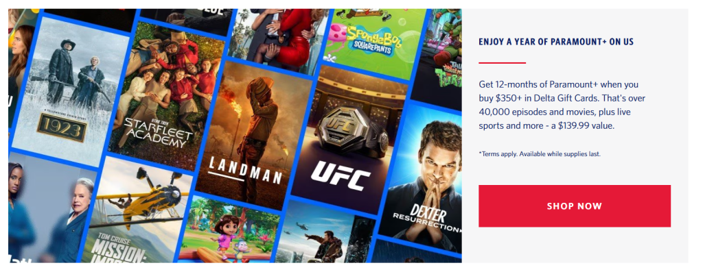 For a limited time, get 12-months of Paramount+ when you buy $350+ in Delta Gift Cards