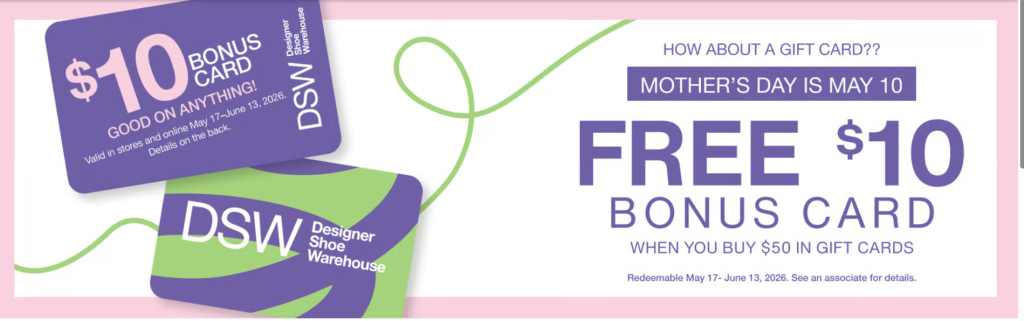 Buy $50 in gift cards and get a $10 bonus card, good on anything! If you qualify, your personal offer code can be found on your Bonus Cards that you will receive in a DSW store, or in an email will sent to you the day before the first day of redemption.