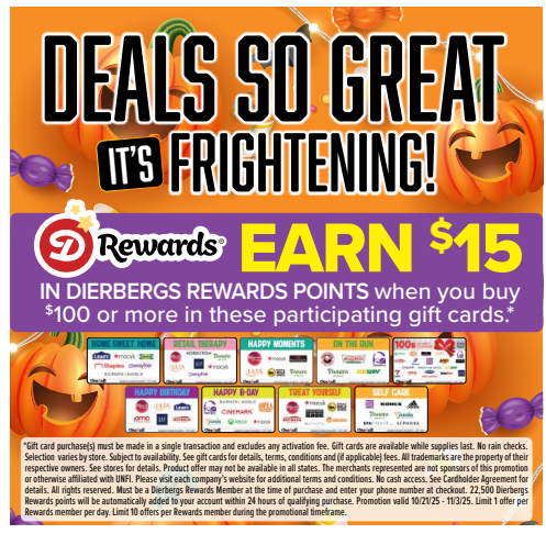 Earn $15 in Dierbergs Rewards Points when you buy $100 or more in these participating gift cards: