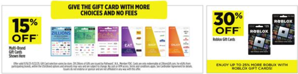 - Save 15% on select Multi-Brand gift cards shown in the weekly ad (see post image):