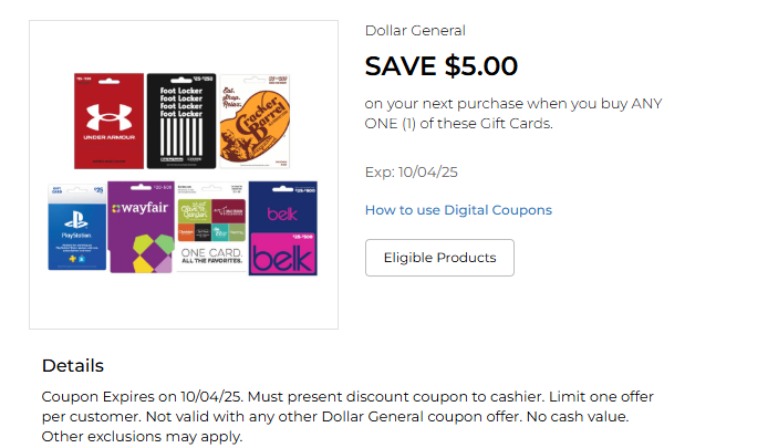 Save $5 on your next purchase of the following gift cards at Dollar General: