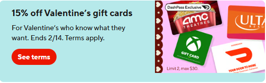 Receive 15% off the following digital gift cards when purchasing from the DoorDash app or website: