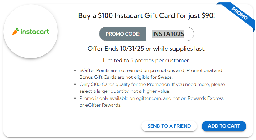 Buy a $100 Instacart Gift Card for just $90 with promo code: INSTA1025