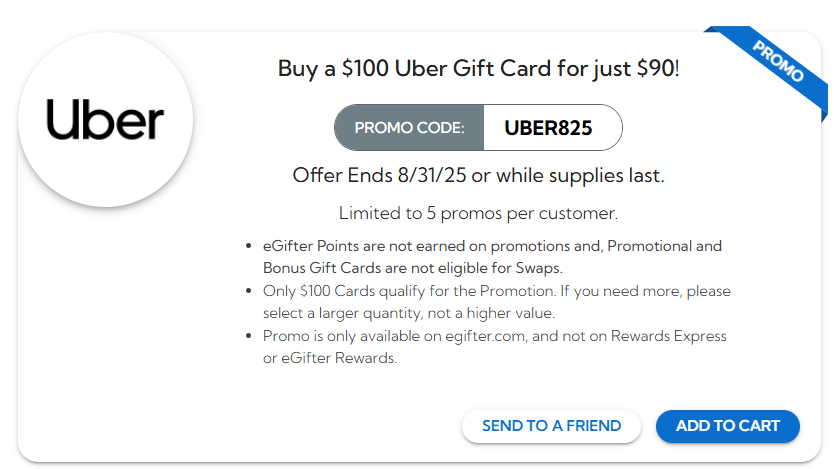 Buy a $100 Uber Gift Card for just $90 with promo code: UBER1025