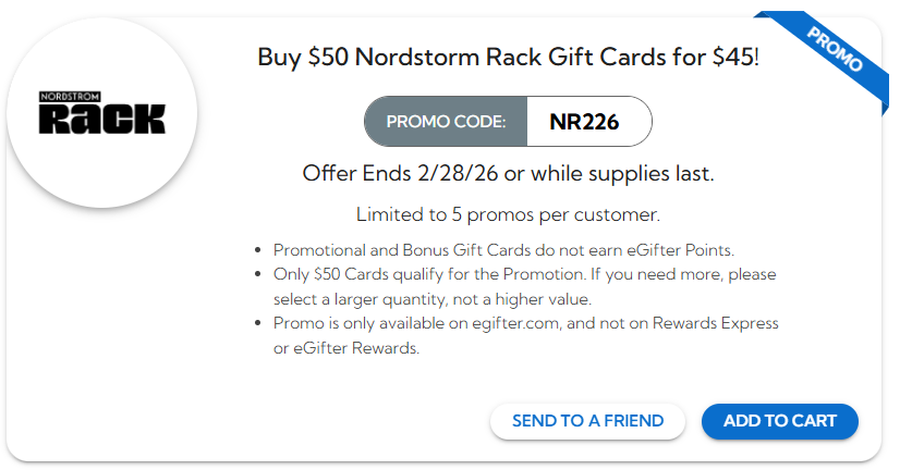 - Buy $50 Nordstorm Rack Gift Cards for $45 with promo code: NR226