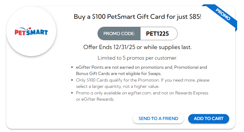 Buy a $100 PetSmart Gift Card for just $85 with promo Code: PET1225