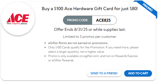 Buy a $100 Ace Hardware Gift Card for just $80 with promo code: ACE825