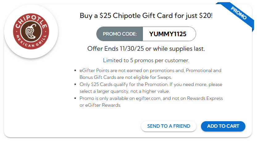 Buy a $25 Chipotle Gift Card for just $20 with promo code: YUMMY1125