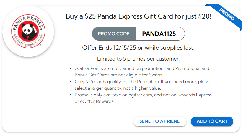 - Buy a $25 Panda Express Gift Card for just $20 with promo code: PANDA1125