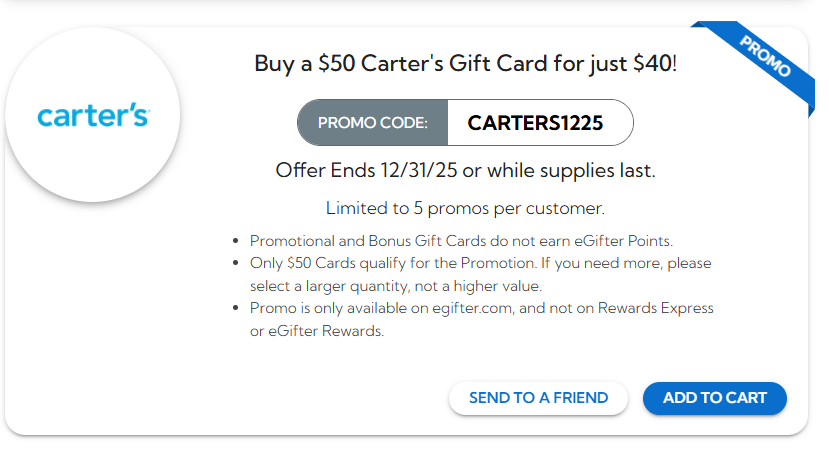 Buy a $50 Carter’s Gift Card for just $40 with promo code: CARTERS1225