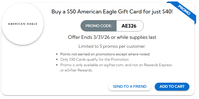 - Buy a $50 American Eagle Gift Card for just $40 with promo code:AE326