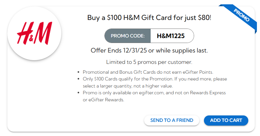 • December 31, 2024 – $100 H&M for $80 with promo code: H&M1224