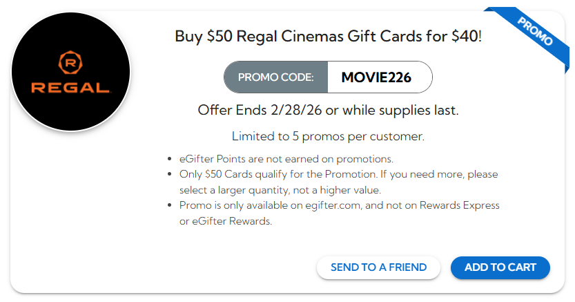Buy $50 Regal Cinemas Gift Cards for $40 with promo code: MOVIE226