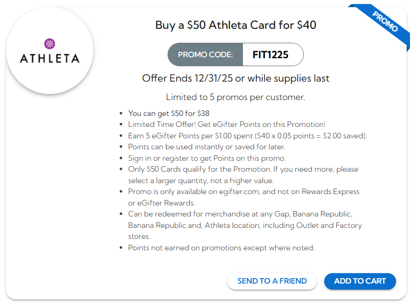 Buy a $50 Athleta Gift Card for just $40 with promo code: FIT1225