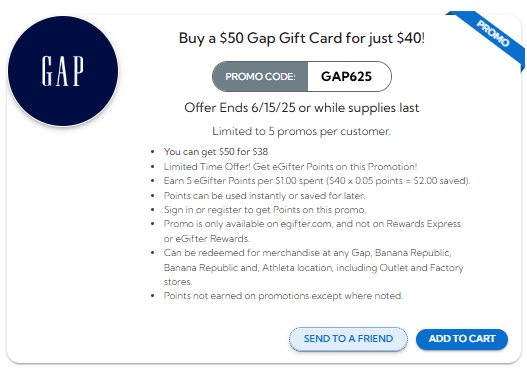 Buy a $50 Gap Gift Card for just $40 with promo code: GAP625