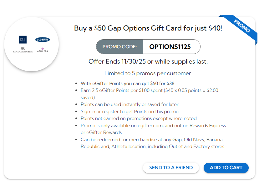 Buy a $50 Gap Options Gift Card for just $40 with promo code: OPTIONS1125