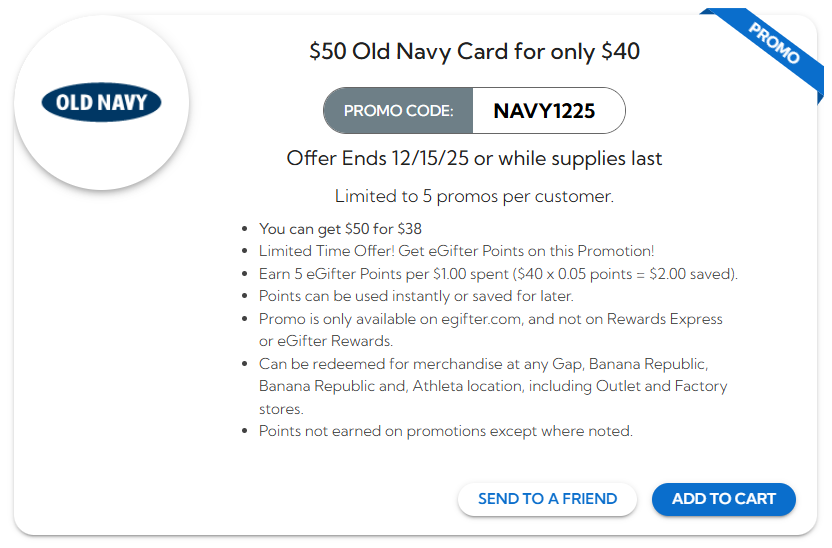 Buy a $50 Old Navy Gift Card for just $40 with promo code: NAVY1225
