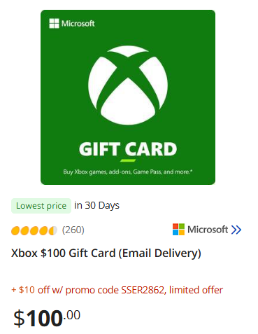 $10 off at checkout on Xbox $100 Gift Card (Email Delivery) w/ promo code SSE3423