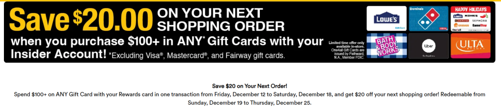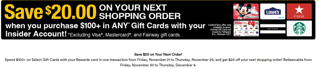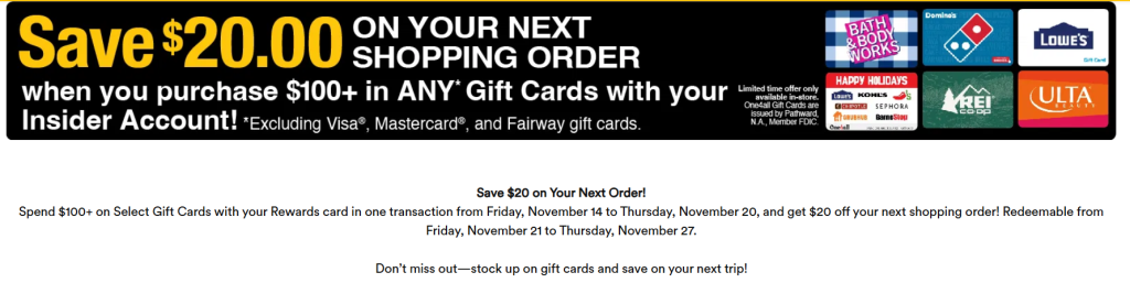 Purchase $100+ in any gift cards with your Rewards card in one transaction, and get $20 off your next shopping order (during the redemption period)