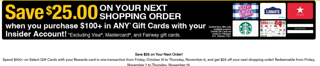 Purchase $100+ in any gift cards with your Rewards card in one transaction, and get $25 off your next shopping order (during the redemption period)
