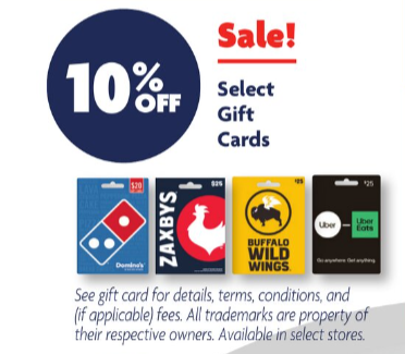 Physical Gift Cards[EXPIRED] Family Dollar: 10% Off Domino’s, Zaxby’s, Buffalo Wild Wings and Uber Gift Cards July 28, 2025August 3, 2025 - by GCanywhere Staff - Leave a Comment The Deal Get 10% off the following dining gift cards: Domino’s Zaxby’s Buffalo Wild Wings Uber Direct link to weekly ad Key Terms Valid July 27 – August 2, 2025 Tips & Ideas