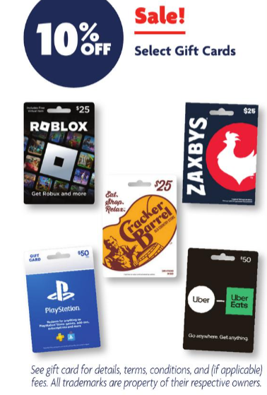 Physical Gift Cards[EXPIRED] Family Dollar: 10% Off Roblox, Zaxby’s, Cracker Barrel, PlayStation and Uber Gift Cards December 21, 2025December 28, 2025 - by GCanywhere Staff - Leave a Comment The Deal Get 10% off the following dining gift cards: Roblox Zaxby’s Cracker Barrel PlayStation Store Uber Direct link to weekly ad Key Terms Valid December 21 – December 27, 2025 Tips & Ideas