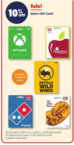 Physical Gift Cards[EXPIRED] Family Dollar: 10% Off Xbox, Applebee’s, Buffalo Wild Wings, Domino’s and Cracker Barrel Gift Cards November 9, 2025November 16, 2025 - by GCanywhere Staff - Leave a Comment The Deal Get 10% off the following dining gift cards: Xbox Applebee’s Buffalo Wild Wings Domino’s Cracker Barrel Direct link to weekly ad Key Terms Valid November 9 – November 15, 2025 Tips & Ideas