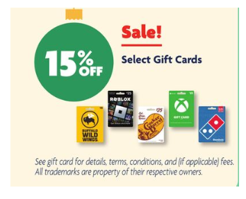 Physical Gift Cards[EXPIRED] Family Dollar: 15% Off Buffalo Wild Wings, Roblox, Cracker Barrel, Xbox and Domino’s Gift Cards November 23, 2025December 5, 2025 - by GCanywhere Staff - Leave a Comment The Deal Get 15% off the following dining gift cards: Buffalo Wild Wings Roblox Cracker Barrel Xbox Domino’s Direct link to weekly ad Key Terms Valid November 23 – November 29, 2025 Tips & Ideas