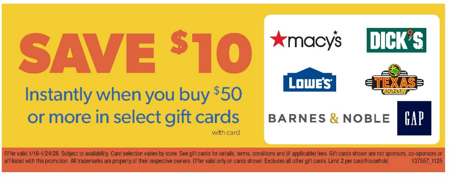 Physical Gift Cards[EXPIRED] Family Fare: 20% Off $50 Macy’s, Dick’s, Lowe’s, Texas Roadhouse, Barnes & Noble and Gap Gift Cards January 18, 2026January 25, 2026 - by GCanywhere Staff - Leave a Comment The Deal Buy $50 in gift cards shown and save $10 instantly. Gift cards in ad include: Macy’s Dick’s Sporting Goods Lowe’s Texas Roadhouse Barnes & Noble Gap Direct link to offer Key Terms Valid January 18 – January 24, 2026 Limit 2 per household Tips & Ideas