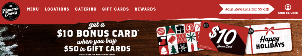 For every $50 in Gift Cards purchased, the purchaser will receive one (1) $10 BONUS Reward Card in-store