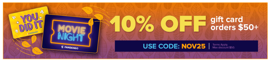 Purchase $50.00 or more worth of Fandango gift card(s) in a single transaction on Fandango.com. At checkout, enter the promo code NOV25 (“Code”) to receive 10% off your purchase.