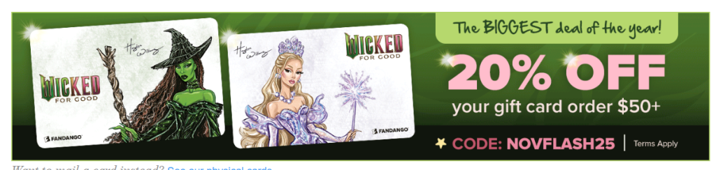 Purchase $50 or more worth of Fandango gift card(s) in a single transaction on Fandango.com. At checkout, enter the promo code NOVFLASH25 (“Code”) to receive 20% off your purchase.