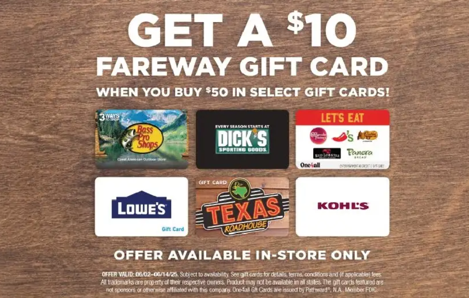 Buy $50 inthe following gift cards and get a $10 Fareway gift card:
