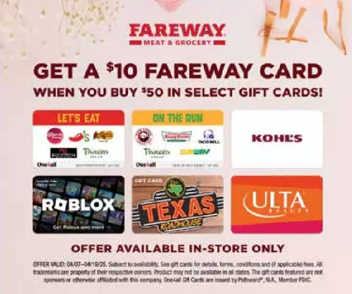 Buy $50 inthe following gift cards and get a $5 Fareway gift card: