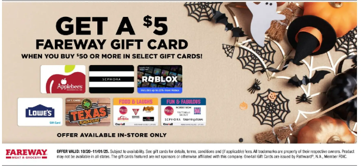 Buy $50 in the following gift cards and get a $5 Fareway gift card: