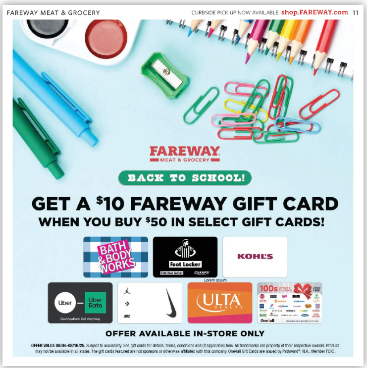 Buy $50 inthe following gift cards and get a $10 Fareway gift card: