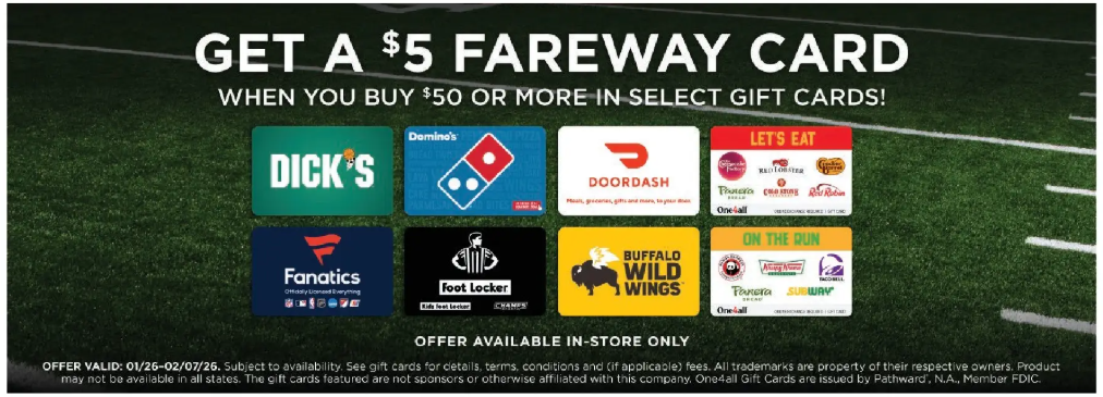 Buy $50 in the following gift cards and get a $5 Fareway gift card: