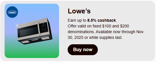 - Lowe’s – up to 8.5% cashback (on fixed $100 and $200 denominations only)