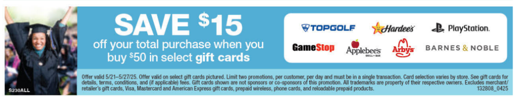 Get $15 off your total purchase when you buy $50 in the following gift cards: