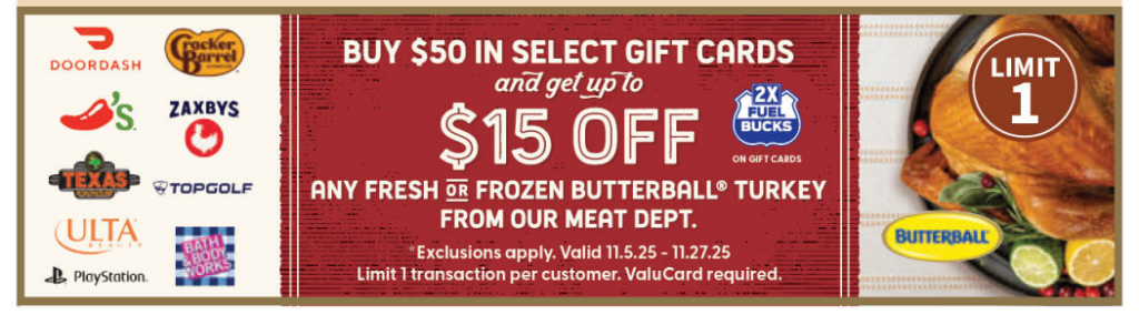 Buy $50 in the following gift cards and get Up To $15 off any fresh or frozen Butterball Turkey from the meat department: