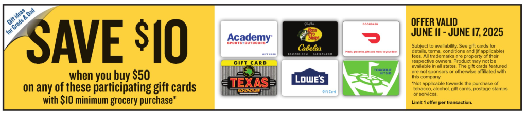 Save $10 off your groceries purchased in the same transaction when you buy $50 in the following gift cards: