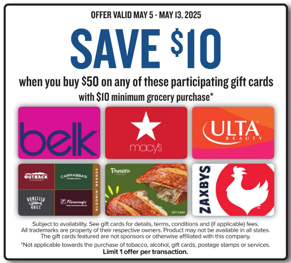 Save $10 off your groceries purchased in the same transaction when you buy $50 in the following gift cards: