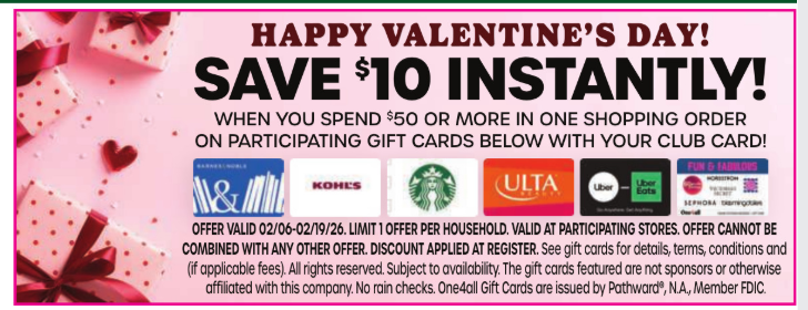 Buy the following gift cards totaling $50 or more in one shopping order and save $10 instantly: