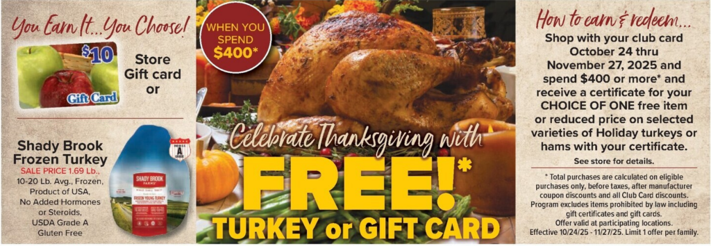 Shop with your club card October 24 thru November 27, 2025 and spend $400 or more and receive your CHOICE OF EITHER a free $10 Foodtown gift card or a free turkey (or reduced price holiday turkeys or hams with your certificate).