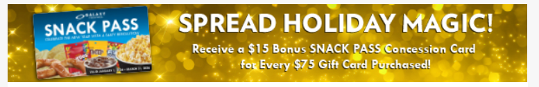 • For every $75 worth of Galaxy Theatres Gift Cards purchased, receive a $15 Snack Pass concession card.