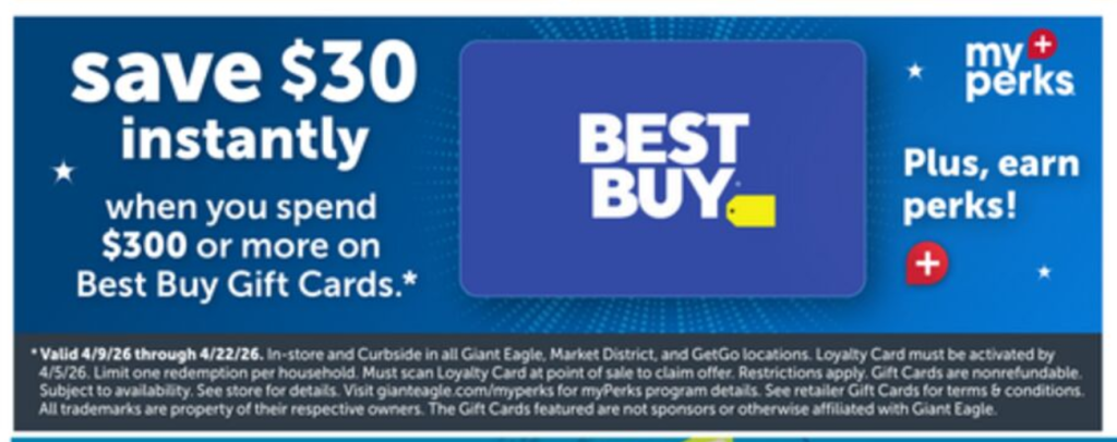 Save $30 instantly when you spend $300+ on Best Buy Gift Cards.