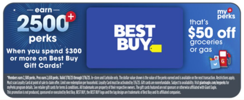 [EXPIRED] Giant Eagle (In-Store and Curbside): Buy $300 Best Buy Gift Card and Get 2500 Perks