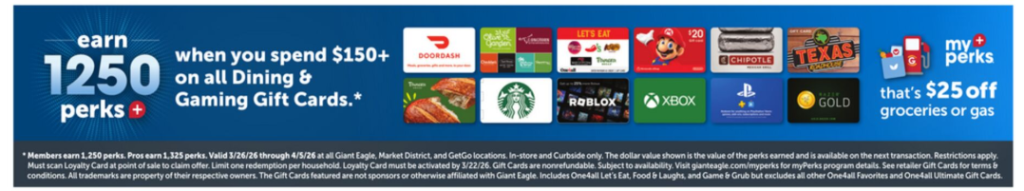 Members earn 1,250 perks, pros earn 1,325 perks when you spend $150 on any dining or gaming gift card. Includes Doordash and Starbucks, One4All Let’s Eat, Food & Laughs, and Game & Grub but excludes all other One4all Favorites and One4all Ultimate Gift Cards.