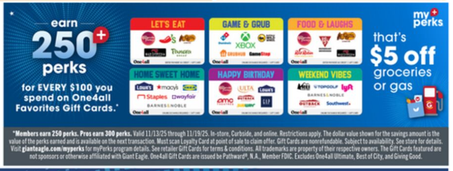 Members earn 250 Perks, Pros earn 300, in-store, Curbside and online for every $100 you spend on the following gift cards (That saves you $5 off gas or groceries):