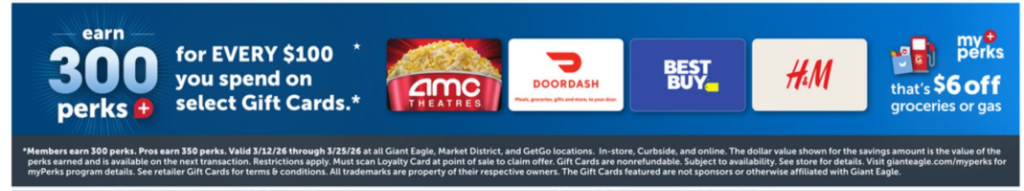 Members earn 300 Perks, Pros earn 350 Perks, in store and online for every $100 you spend on the following gift cards (that saves you $6 off gas or groceries):